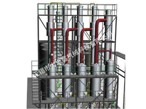 工作原理:四效降膜蒸發(fā)器需濃縮的料液由泵送入加熱管頂部,沿著加熱管內(nèi)壁形成液膜向下流動(dòng)。在這個(gè)過(guò)程中,由于管外的加熱,管內(nèi)液膜開(kāi)始沸騰并部分蒸發(fā)